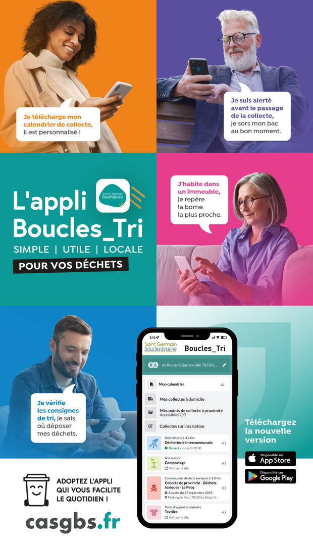 N'hésitez pas également à télécharger l'application Boucle_Tri, sur laquelle vous retrouverez votre calendrier personnalisé, des informations sur les collectes et autres astuces.