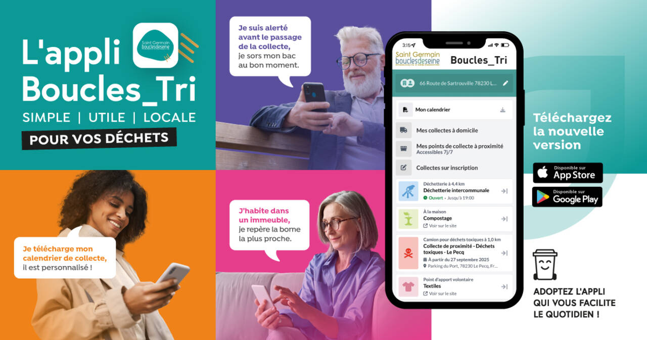 La Communauté d'Agglomération Saint-Germain Boucles de Seine met à disposition de ses habitants l'application BOUCLE_TRI : utile pour s'informer sur les jours et heures de collectes des déchets mais également pour se rappeler les bonnes pratiques du tri. En renseignant précisément votre adresse, vous obtiendrez vos jours et heures de collecte de manière personnalisée, et ce, pour chacun des flux de déchets : emballages et papiers, verre, encombrants, déchets spéciaux et toxiques, déchets végétaux et ordures ménagères.