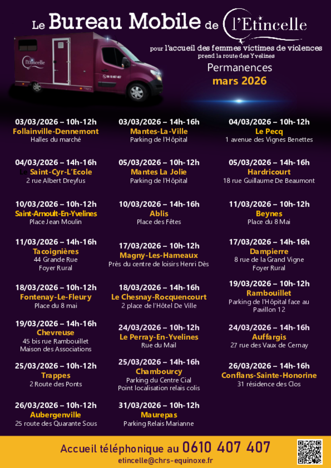 Le bureau mobile de l'Étincelle, dispositif d'information et d'accompagnement des femmes victimes de violences, sera présent le 25 mars 2026, sur le site de Carrefour, à proximité du Point de localisation des relais colis, de 14h à 16h.
